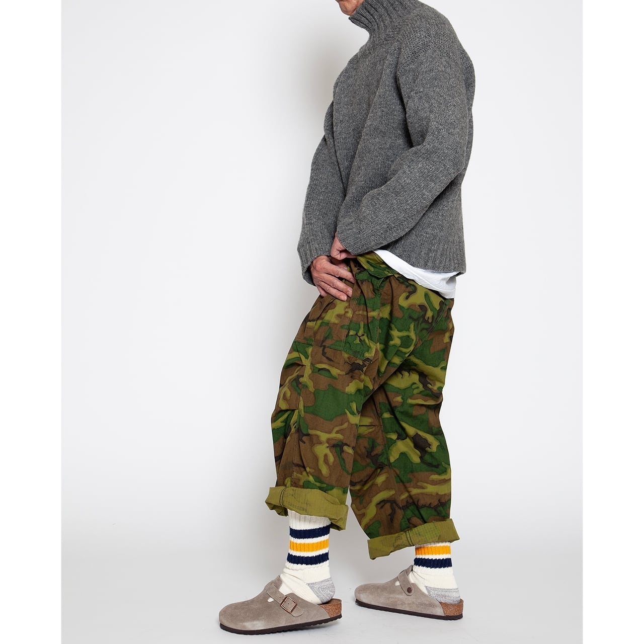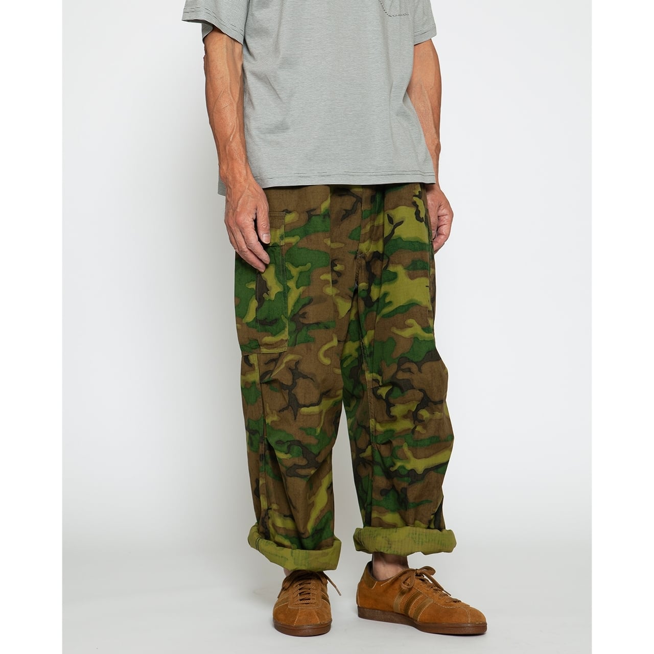 当時のプリント手法を再現した、どこか滲んだような独特の柄の表情が、ヴィンテージさながらの奥行きを感じさせます。圧倒的な存在感を放つワイドシルエットと、歴史的な迷彩パターンの融合。ミリタリーの無骨さを、洗練された大人の遊び心へと昇華させた傑作です。