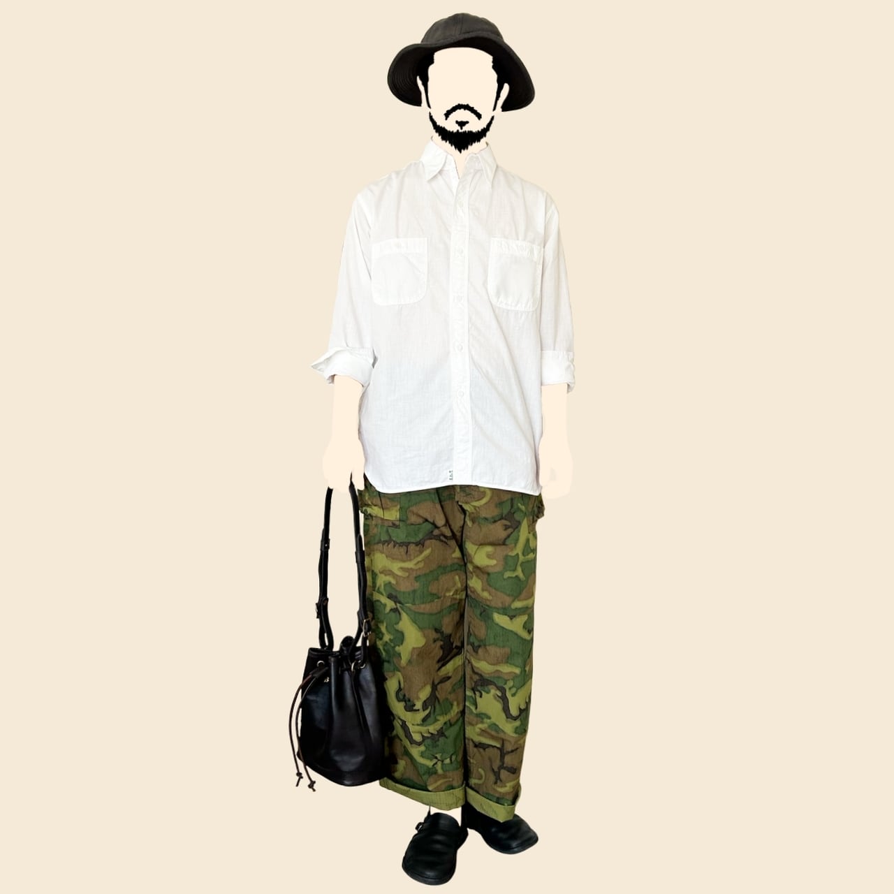 主役は、FATIGUE SLACKS(THE CORONA UTILITY)の「M-43 CARGO SLACK」。迷彩の表情豊かなコットンリップストップ生地が、コーディネートに力強いアクセントを与えます。