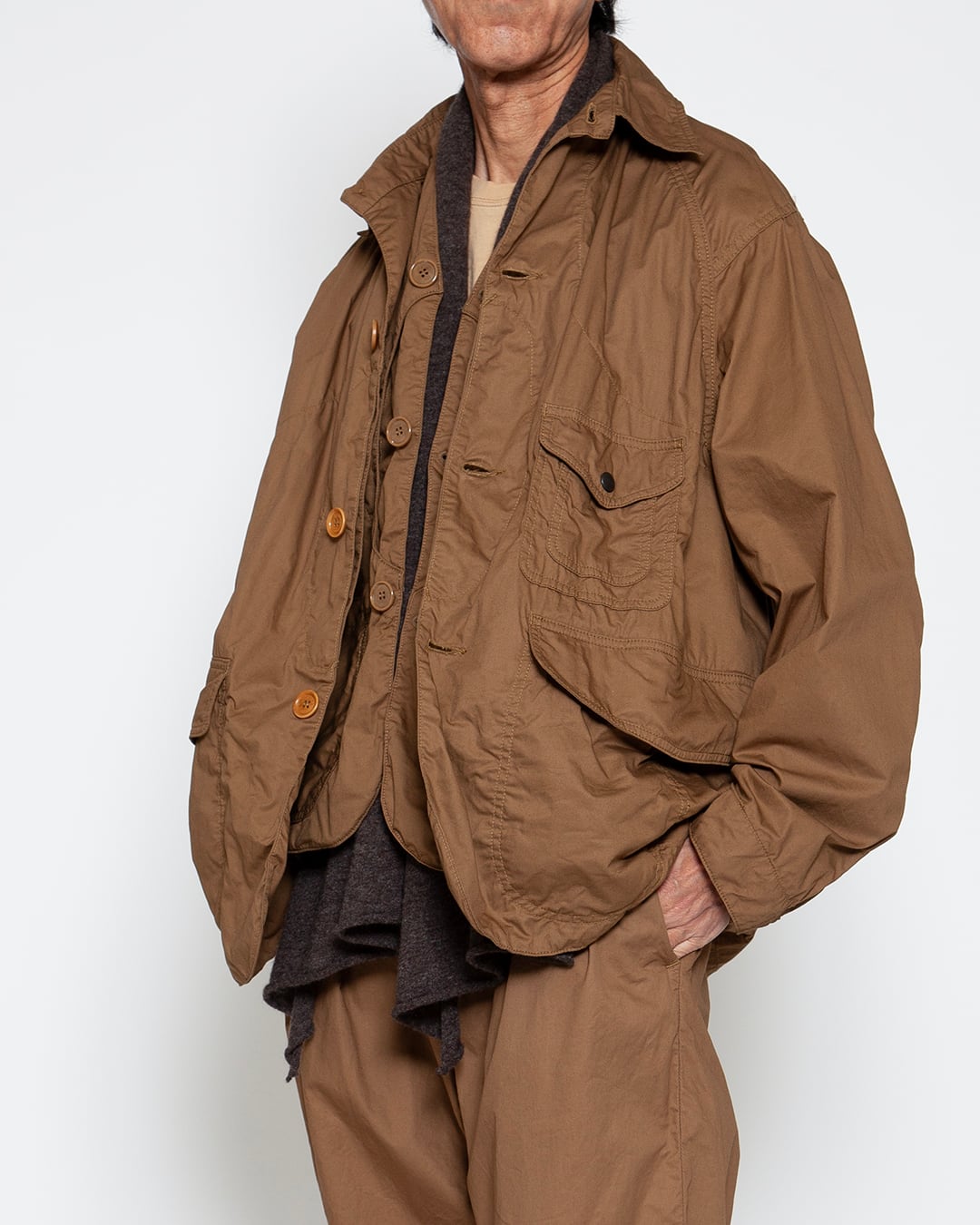 ビンテージワークジャケットのボディに、1930年代前後のハンティングジャケットの特徴的なディテールを取り入れ、デイリーウエアとしてデザインされたものです。