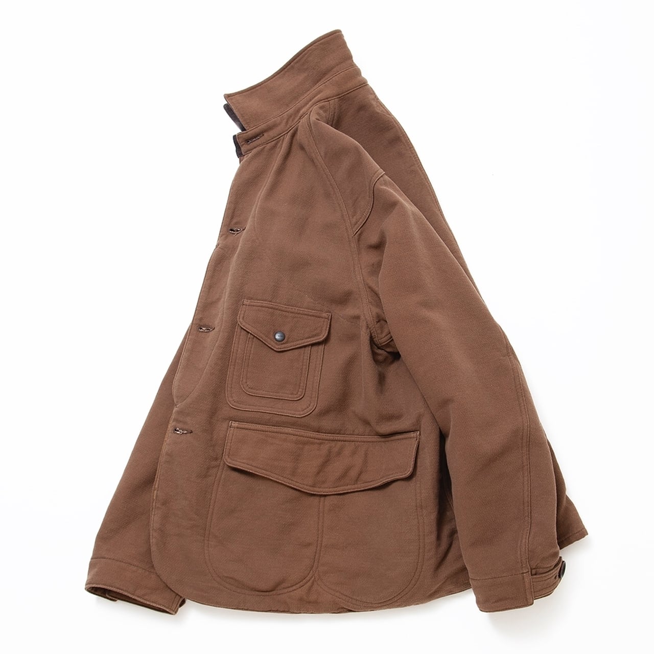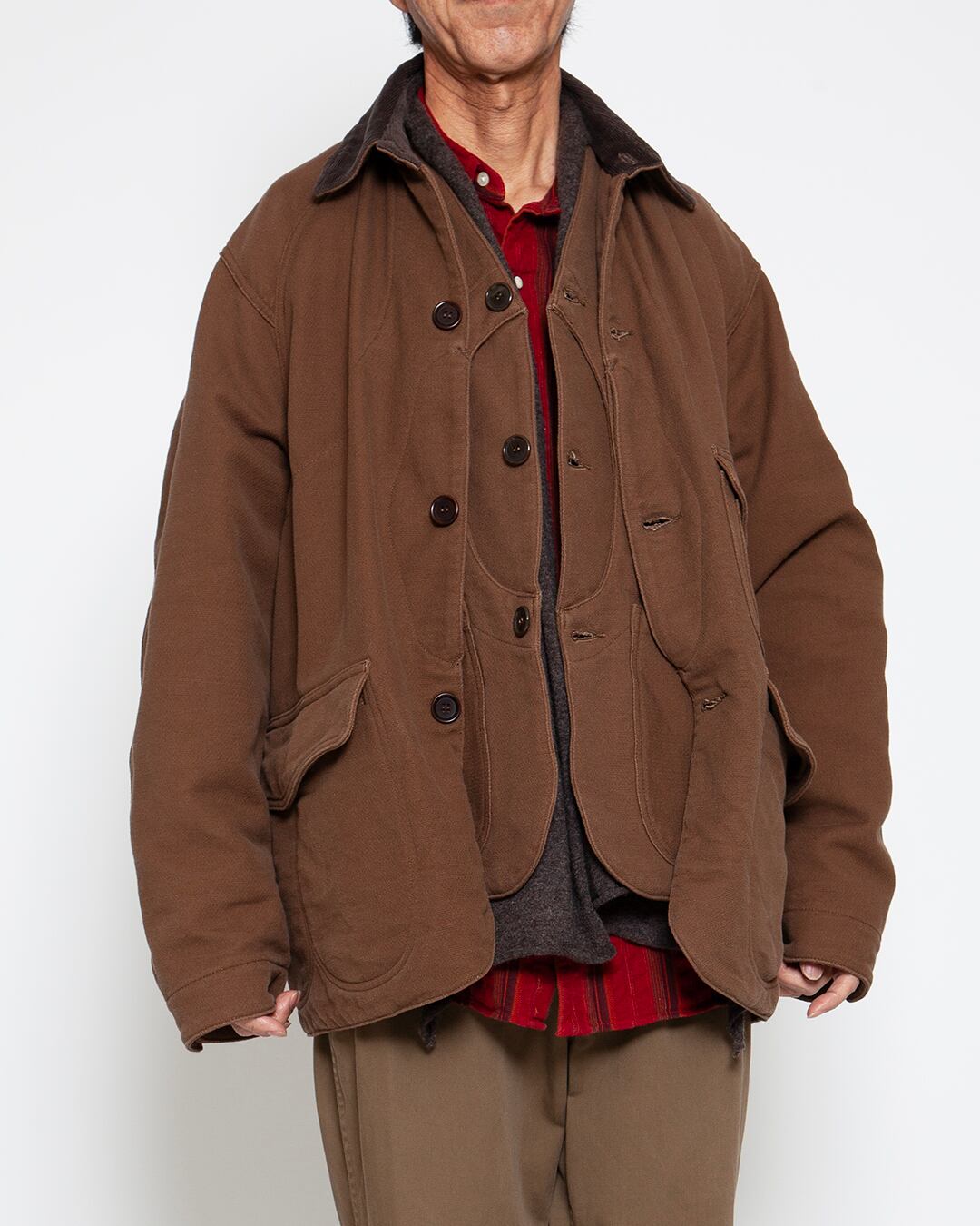 ビンテージワークジャケットのボディに、1930年代前後のハンティングジャケットの特徴的なディテールを取り入れ、デイリーウエアとしてデザインされたものです。