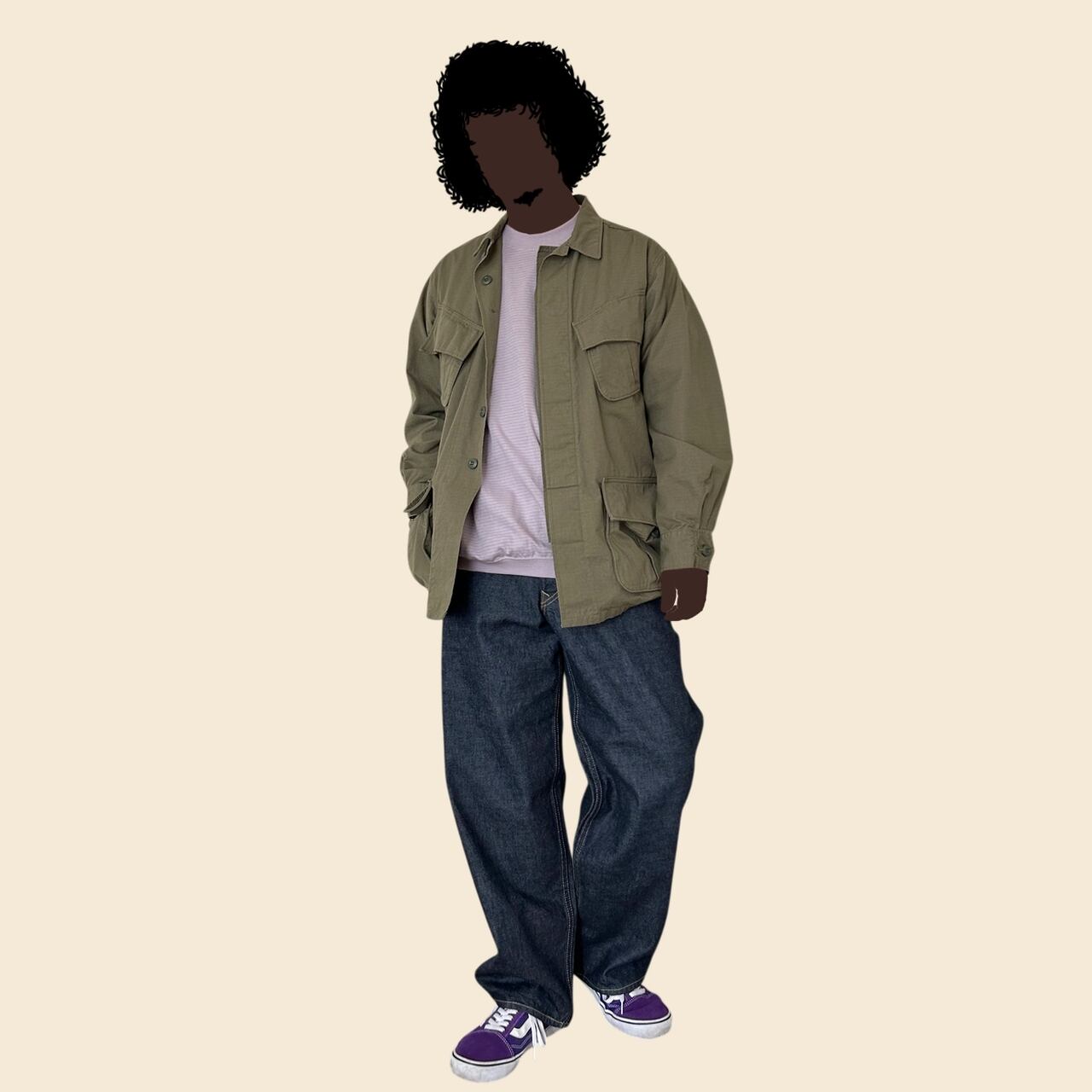 例えば、身長170cm、体重60kgの標準体型の方であれば、42(M)サイズが一般的な推奨サイズとなります。42(M)を穿くと、ウエストは多少ゆとりがありヒップ側に少し下ろした着こなしが出来ます。ワタリから裾にかけてたっぷりとゆとりを持ったルーズでファットなシルエットが形成されますのでリラックス感のある肩の力が抜けた、こなれた雰囲気を演出してくれます。