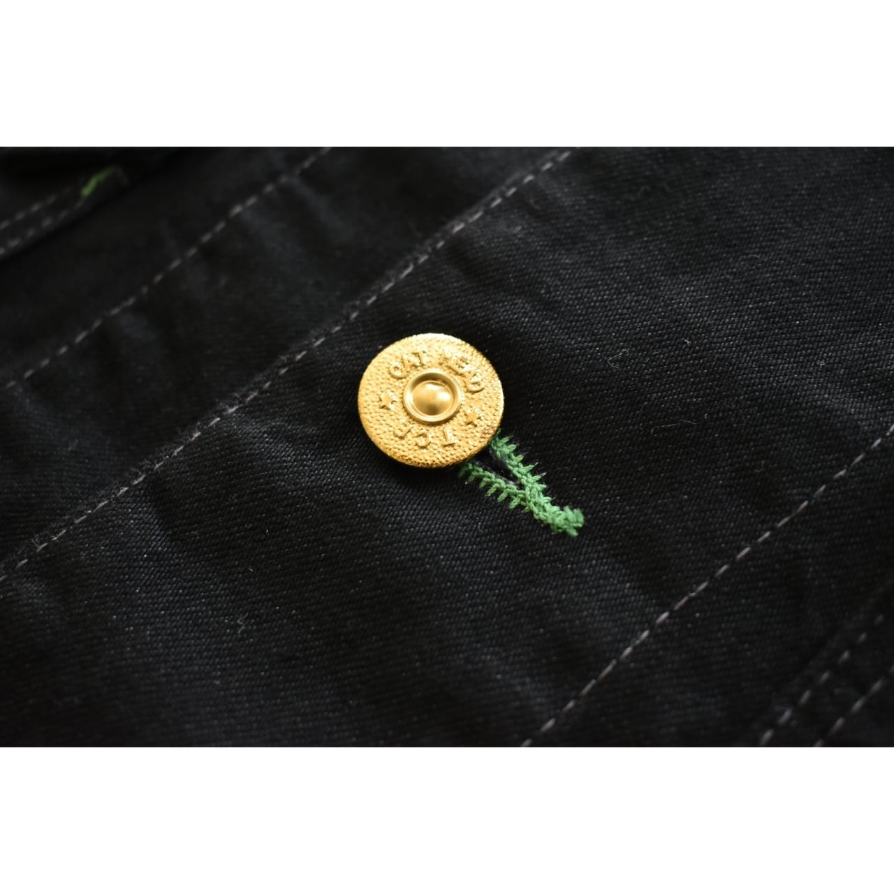 Cat Head JKの縫製上の特徴でもある、グリーンのボタンホールとバータックがこの真っ黒の生地によく映えるのもポイント。
