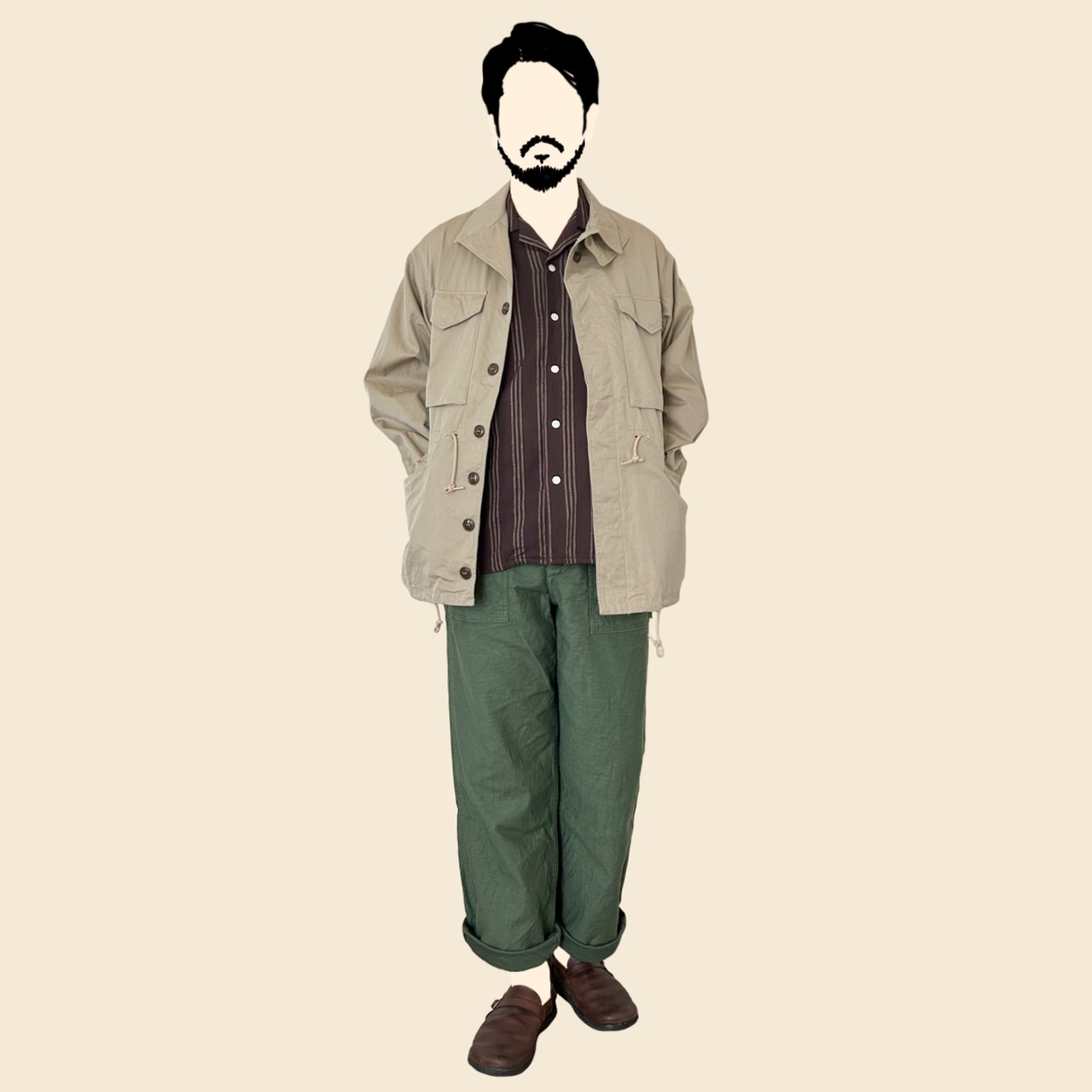 深みのあるブラウンに、ベージュのストライプが映える一着。ヴィンテージライクな落ち着いた雰囲気が、コーディネート全体を上品にまとめます。チノパンやデニムと合わせれば、アメカジテイストを格上げ。ジャケットのインナーとしても、さりげないアクセントになります。