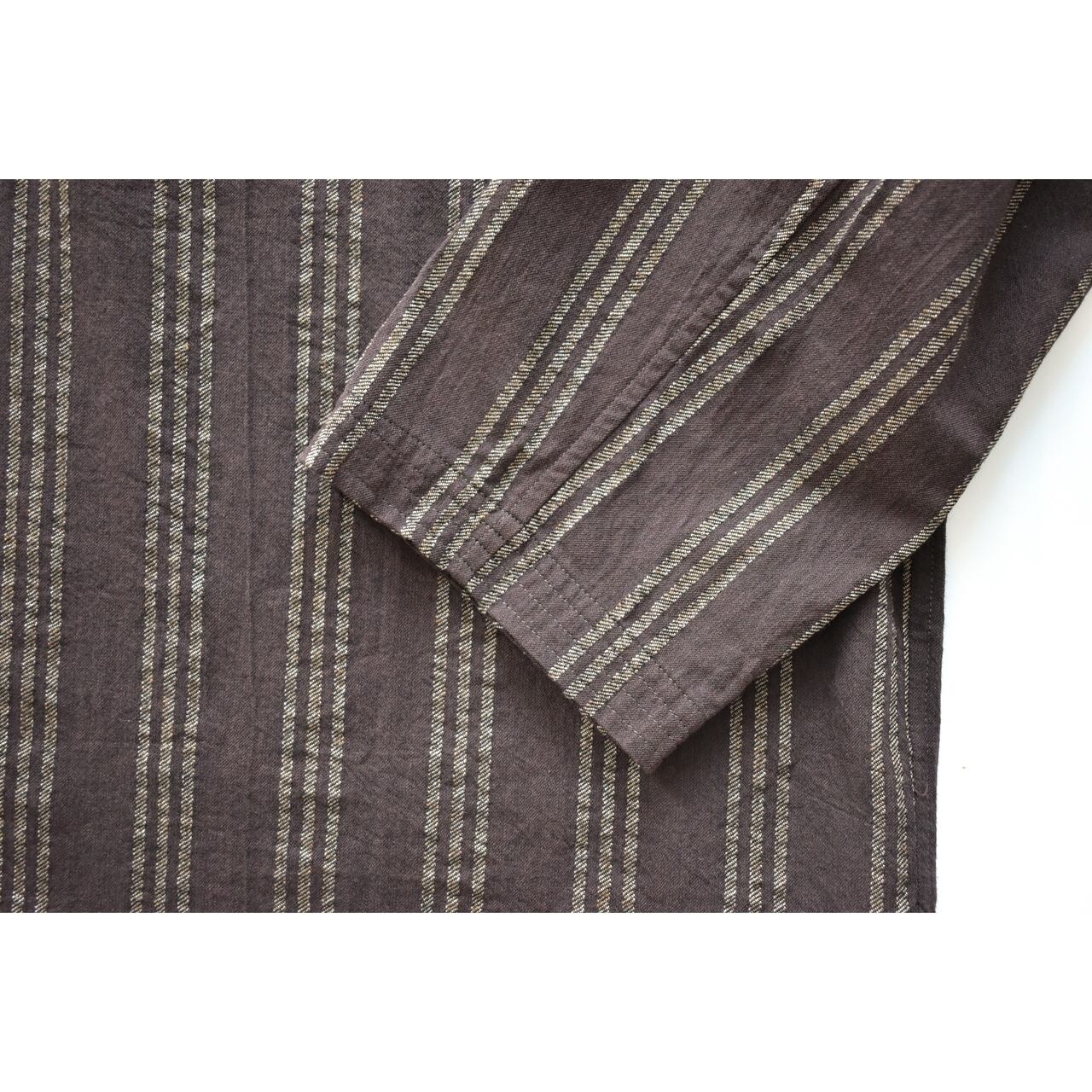 深みのあるブラウンに、ベージュのストライプが映える一着。ヴィンテージライクな落ち着いた雰囲気が、コーディネート全体を上品にまとめます。