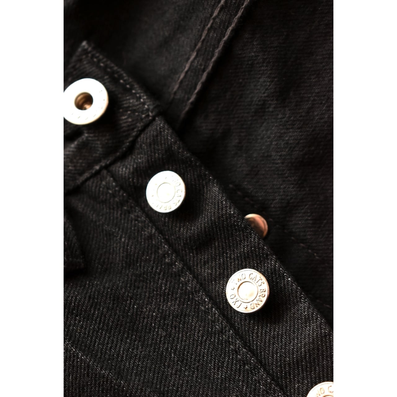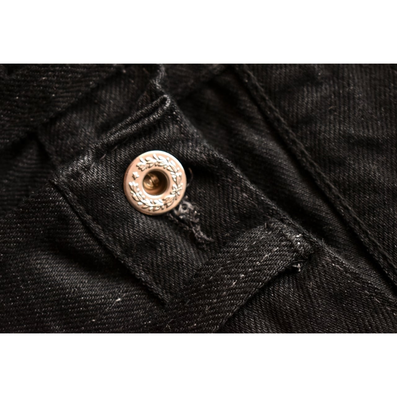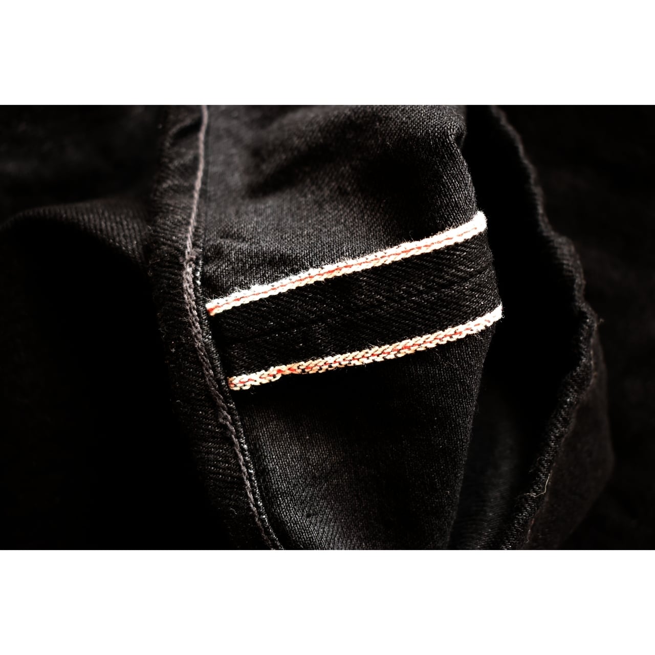 米綿を主体とした縦糸7番、緯糸6番を用いて、ナチュラルムラの糸を硫化先染めでブラックに仕上げました。先染めなので、縦落ちやヒゲも出てきますので、ブラックジーンズの経年変化を楽しんでいただけます。
