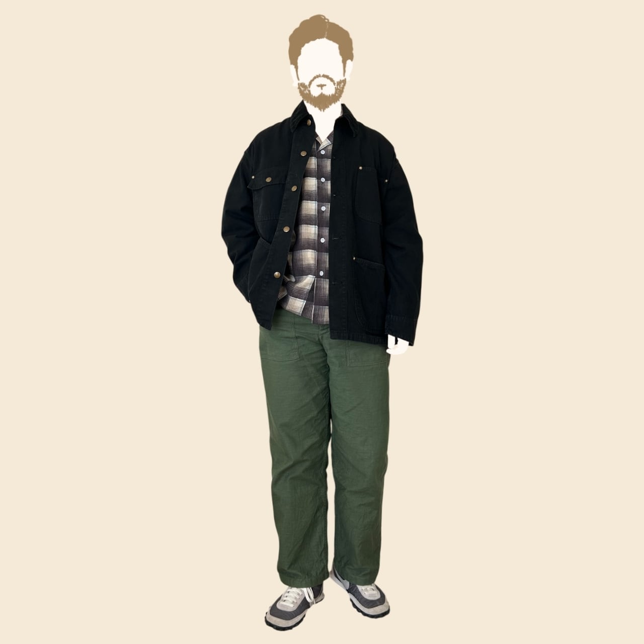 このカバーオールは、デニムのインディゴとは一線を画す、シックで洗練された雰囲気が最大の魅力。