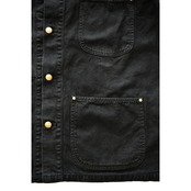 製品加工によるヴィンテージ感あるブラックと、襟のブラックコーデュロイのコントラストが、都会的でありながら無骨なワークの要素も併せ持つ絶妙なバランスを演出します。