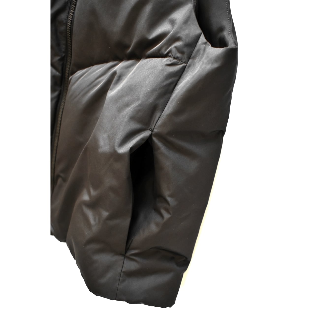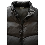 このベストの洗練されたポイントは、ダウン特有のキルティングステッチをあえて内側に隠している点にあります 。これにより、ダウンのボリューム感を抑え、すっきりとしたミニマルな表情になり、都会的な大人の装いにぴったり馴染みます。高さのあるスタンドカラーも、首元からの冷気の侵入を防ぎ、マフラー要らずの暖かさを提供してくれます。