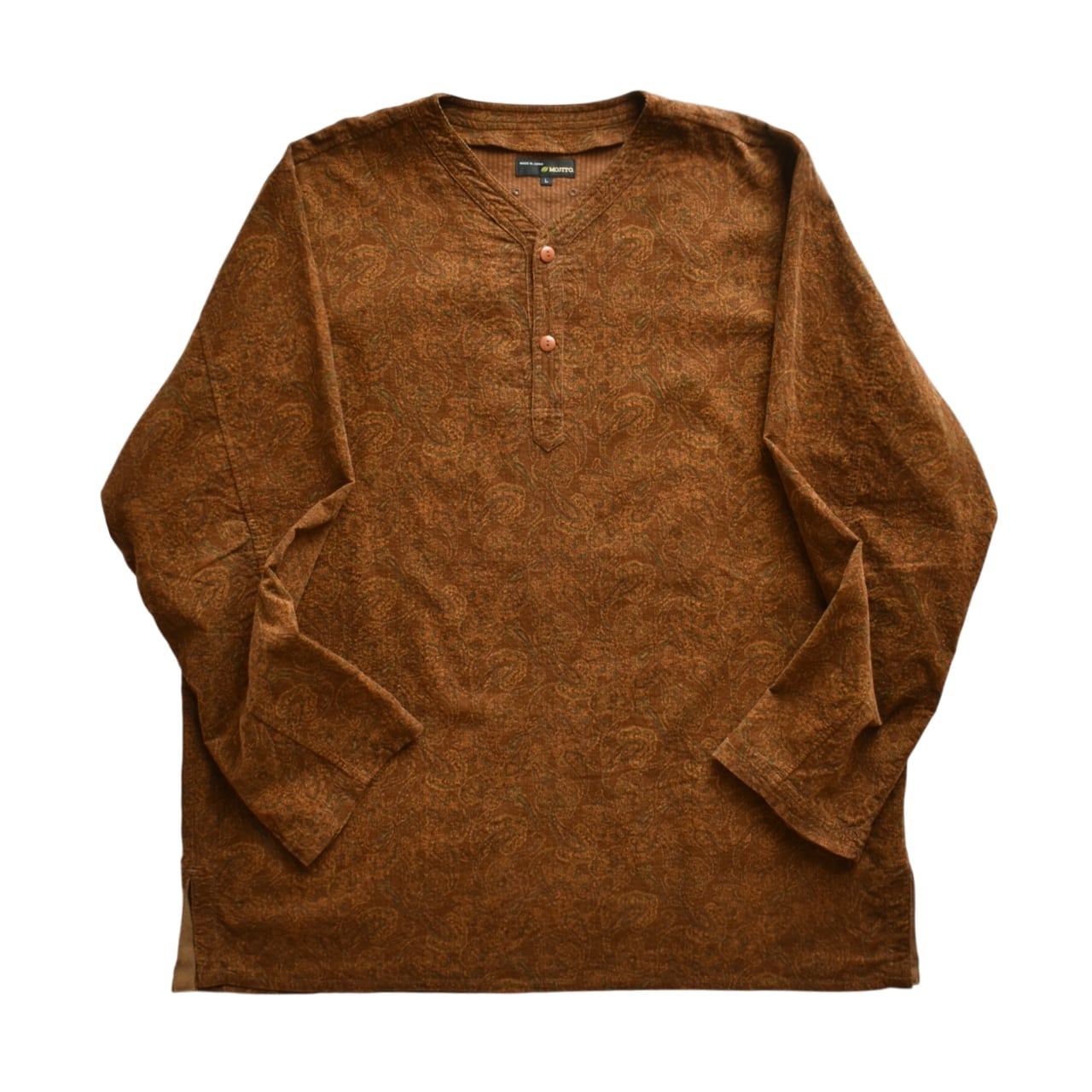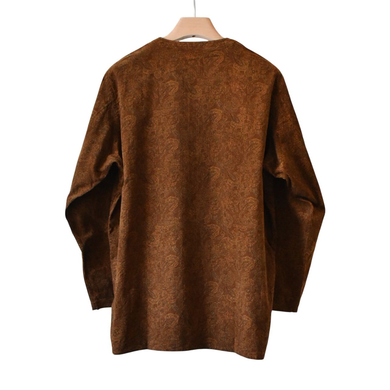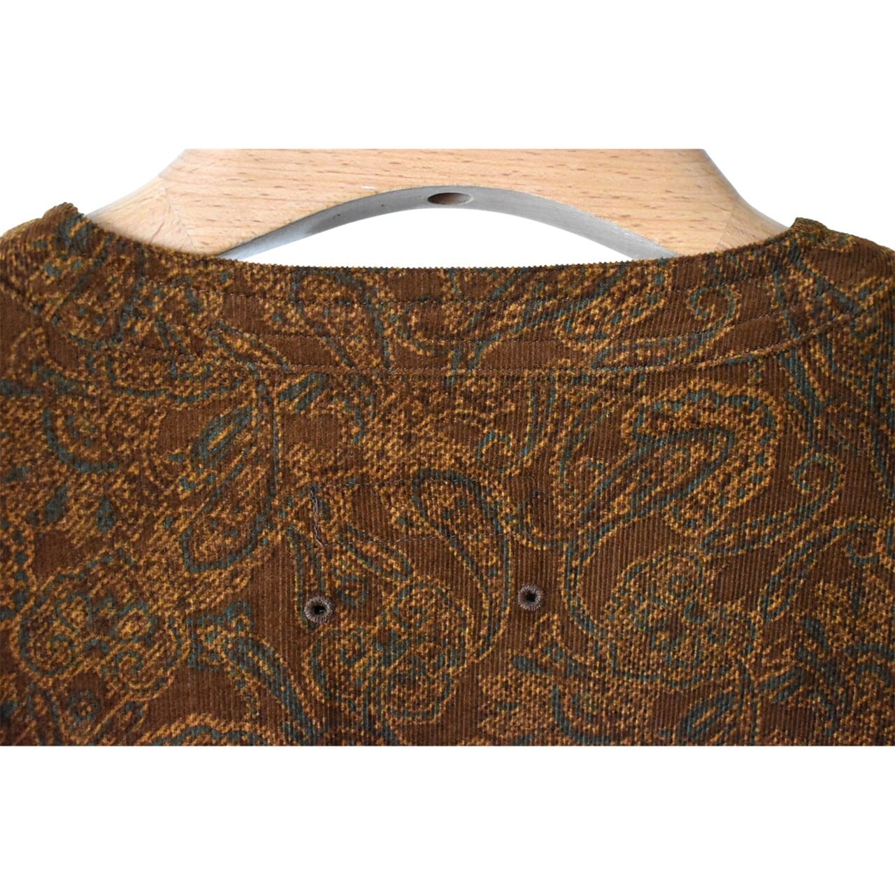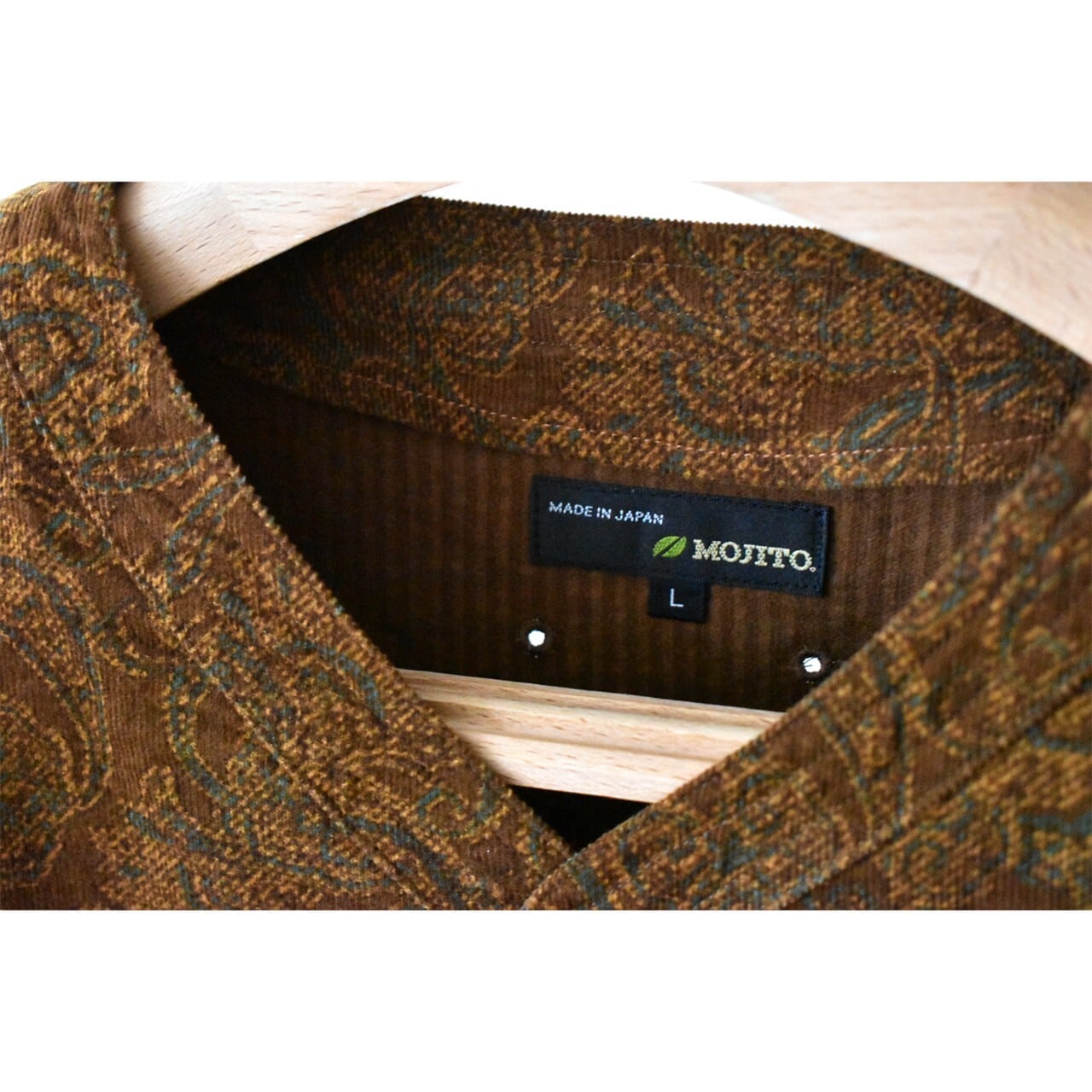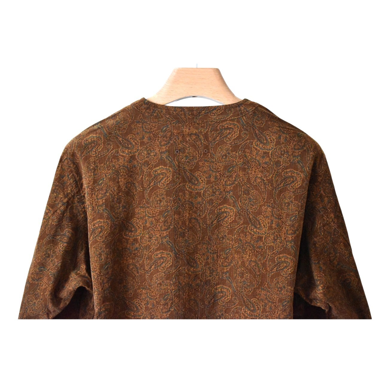生地は細畝のコーディロイにペイズリー柄がプリントがされたcord print。程よい厚みが扱いやすいので春秋冬と活躍してくれます。良くも悪くも独特の雰囲気を醸し出しやすいペイズリー柄の中でも上品さと大人の色気を感じさせる好配色かつバランスのよい大きさの柄となっています。