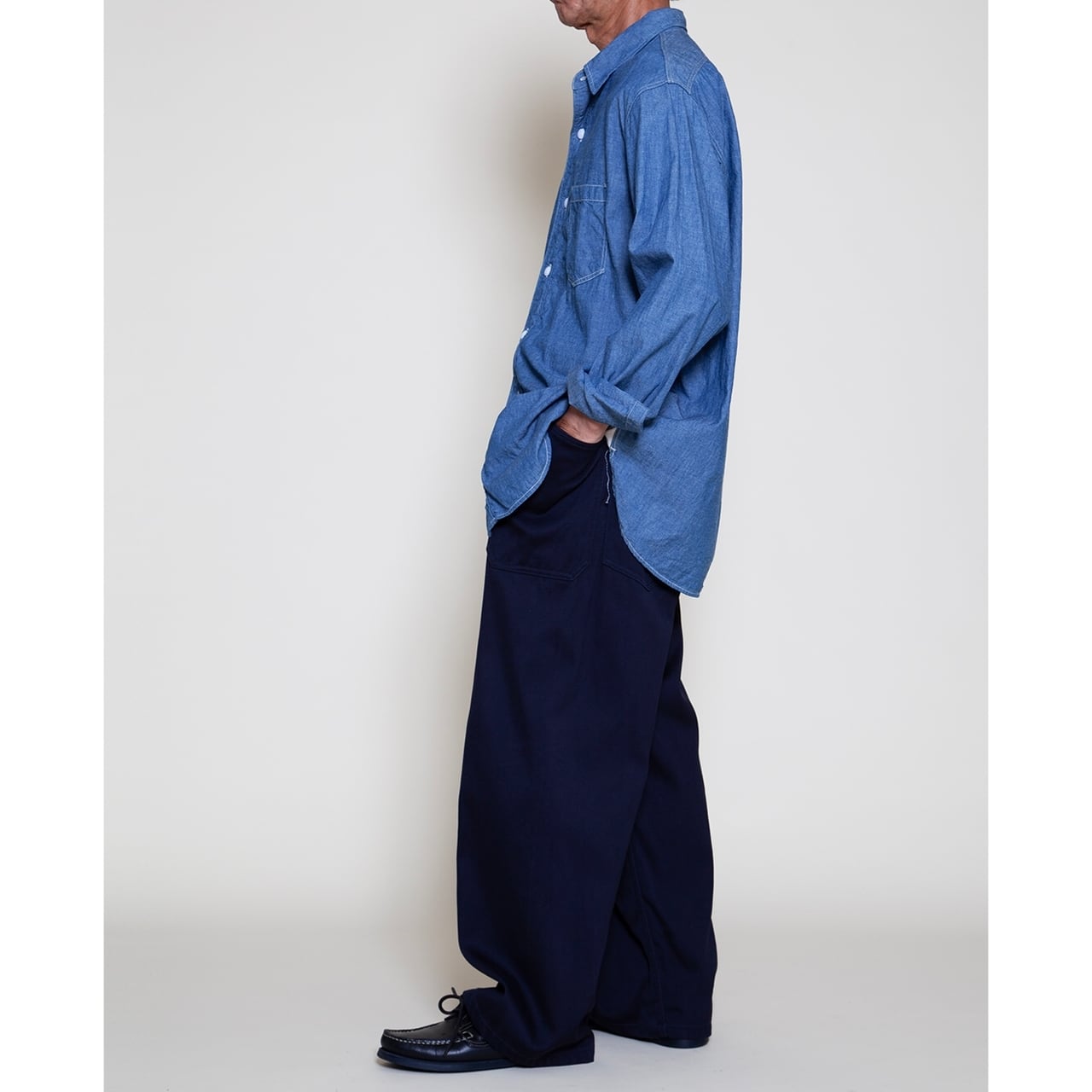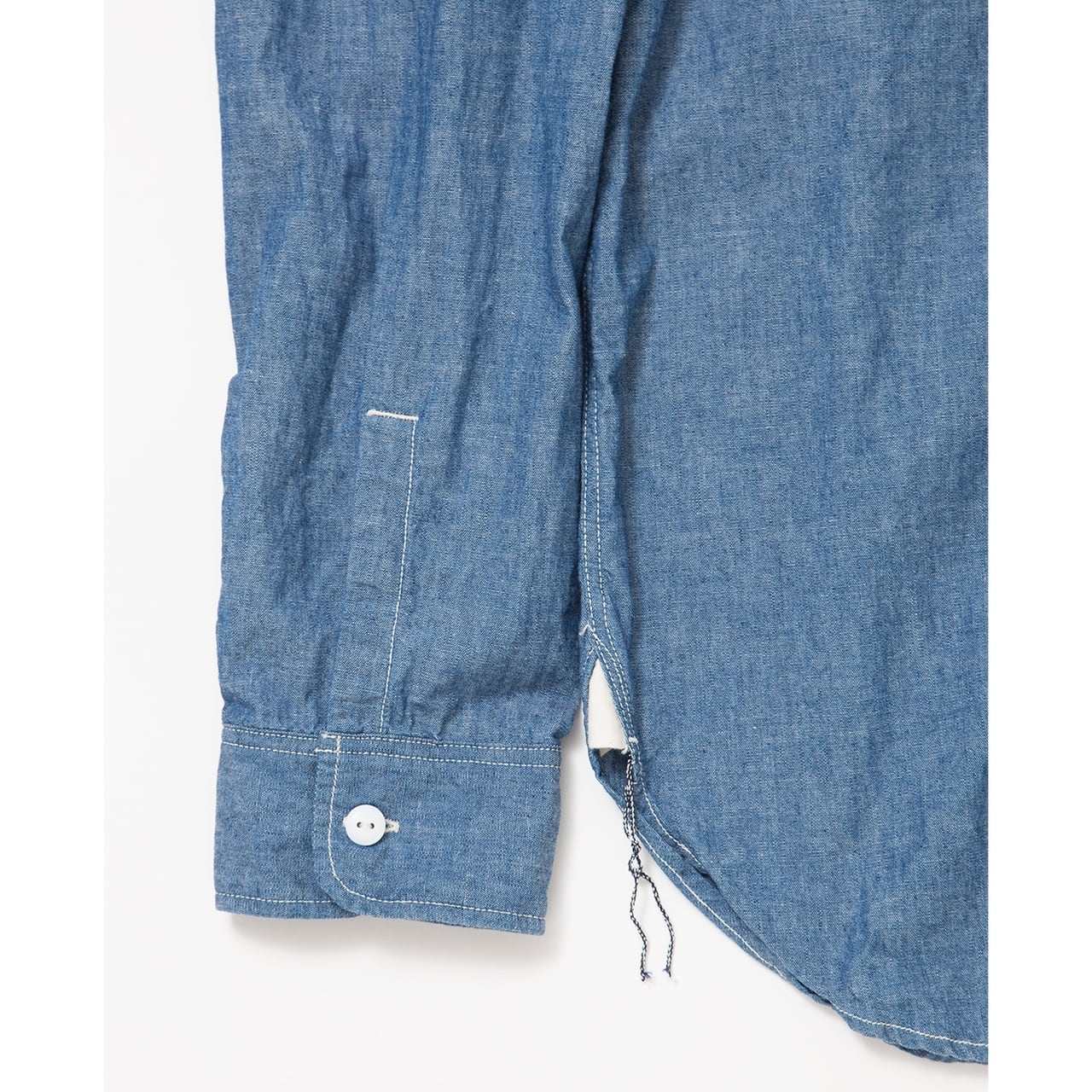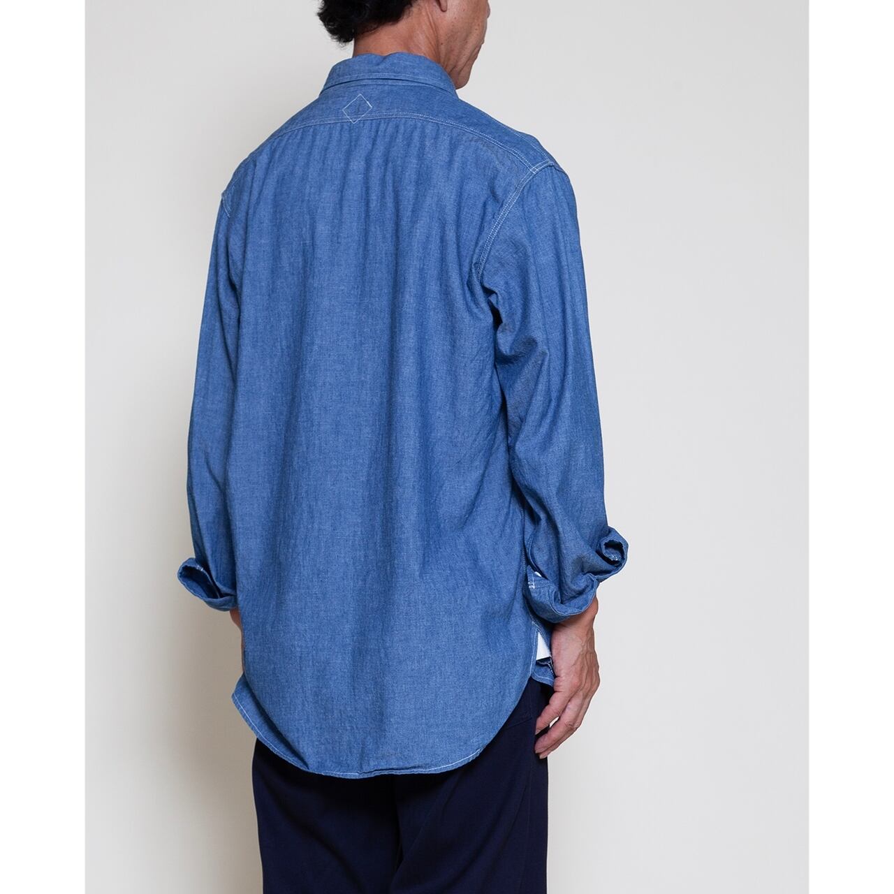 2006 年のブランド・ファーストシーズンから使い続けている定番のワーク・シャンブレーの生 地。経糸をロープ染色し旧式の軽布用力織機を使用して製織しています。 力織機を使用する事で、薄手ですが洗い後もしっかりとしたハリコシが残ります。