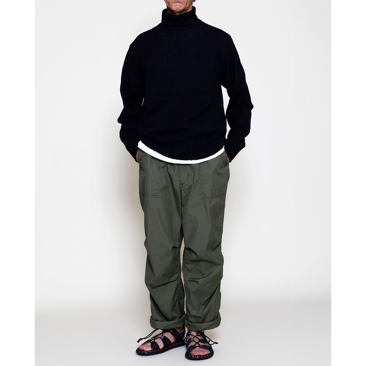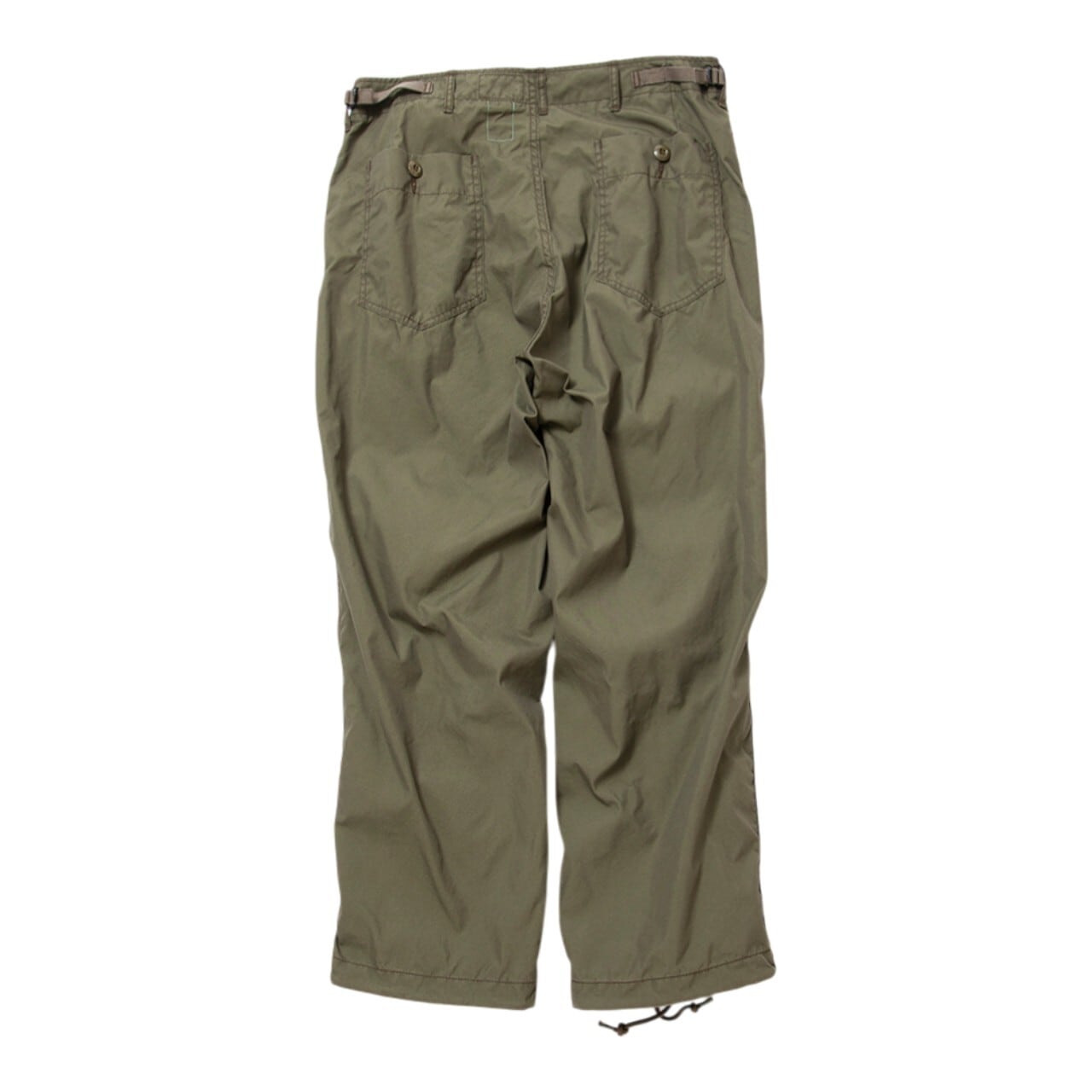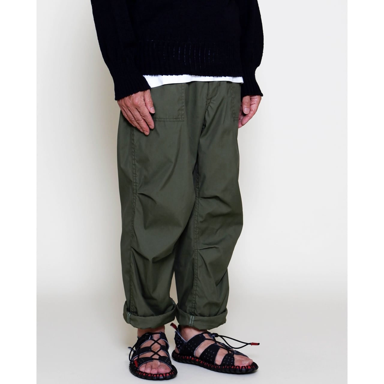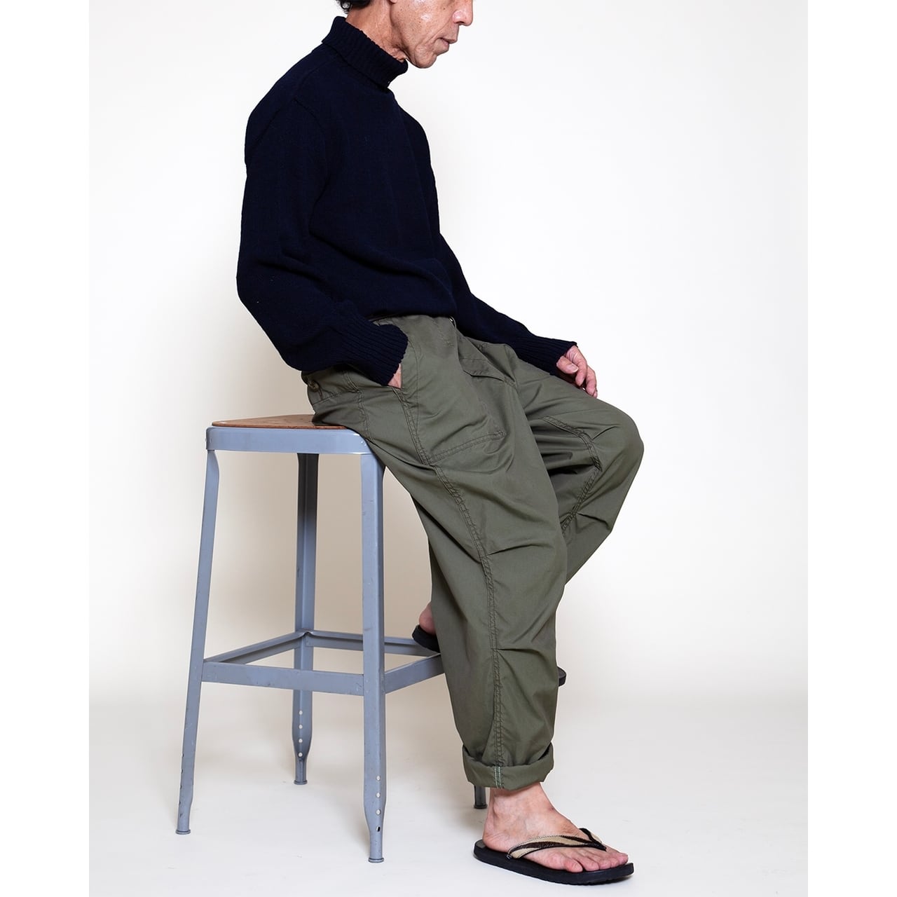 "1950 年代・米軍の軍事演習用” アグレッサーユニフォーム(仮想敵国ユニフォーム)” のボトムスを 基に作られたアイテムです。 前後4つのパッチポケットのシンプルなディテールですが、膝に2本のタックが入る立体的な身頃の 作りとなっています。膝を中心に前身頃が弓なりにカーブする完全オリジナルシルエットです。 太いワタリから裾に向けてゆるくテーパードする穿き易い形で、後身頃のバランスがやや大きいとても