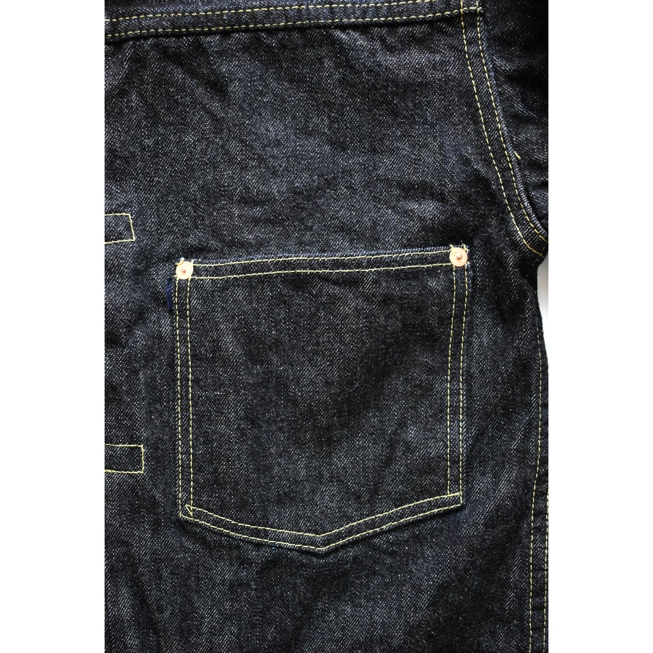 生地には、当時のアメリカ綿を再現すべく3種類の米綿をブレンドし、強撚のネップ糸と綿葉カスを混ぜて紡績したTCBオリジナルの14ozデニムを採用。