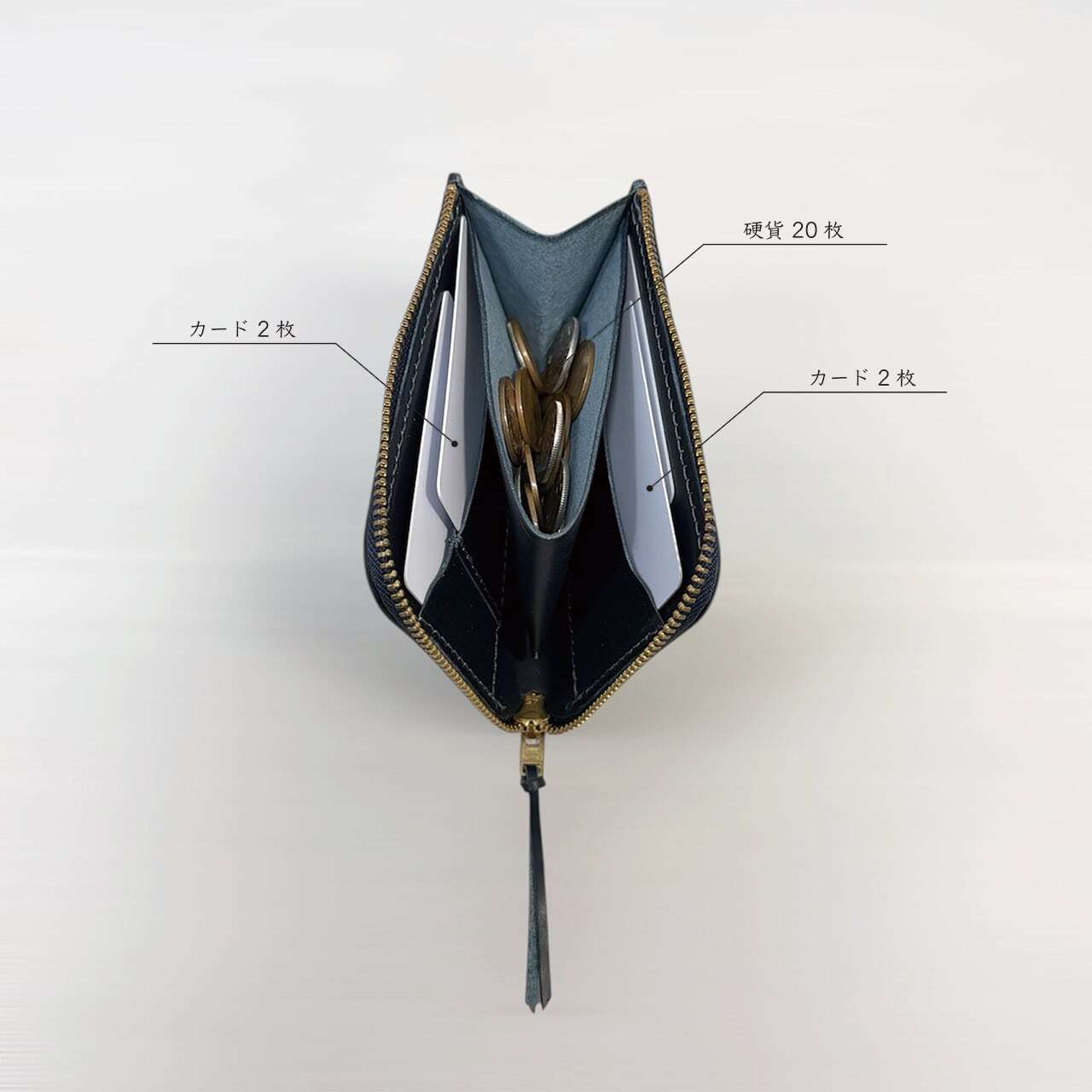 内側の両サイドにはカード室を備え、カード類や二つ折りにしたお札もスマートに仕分け可能です。