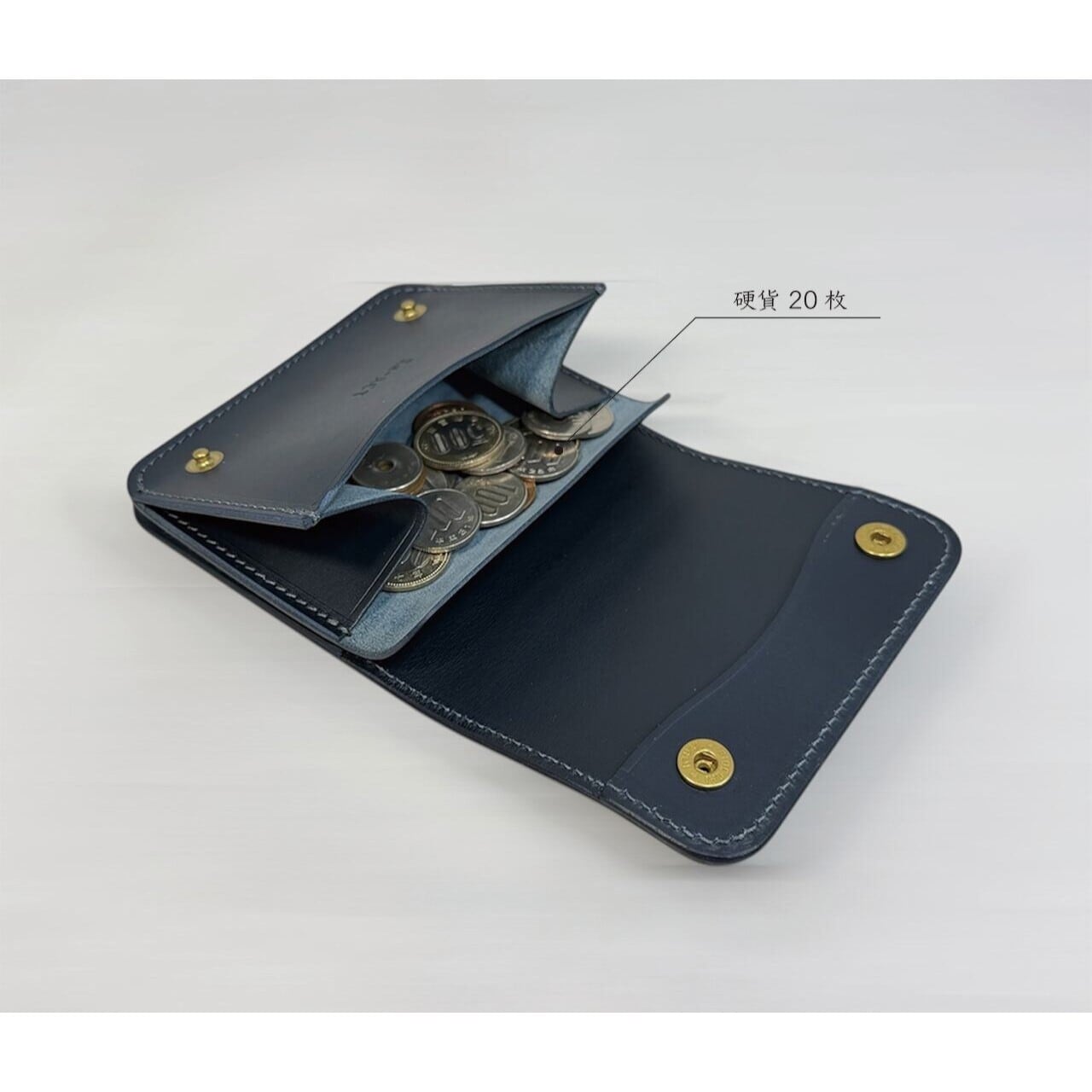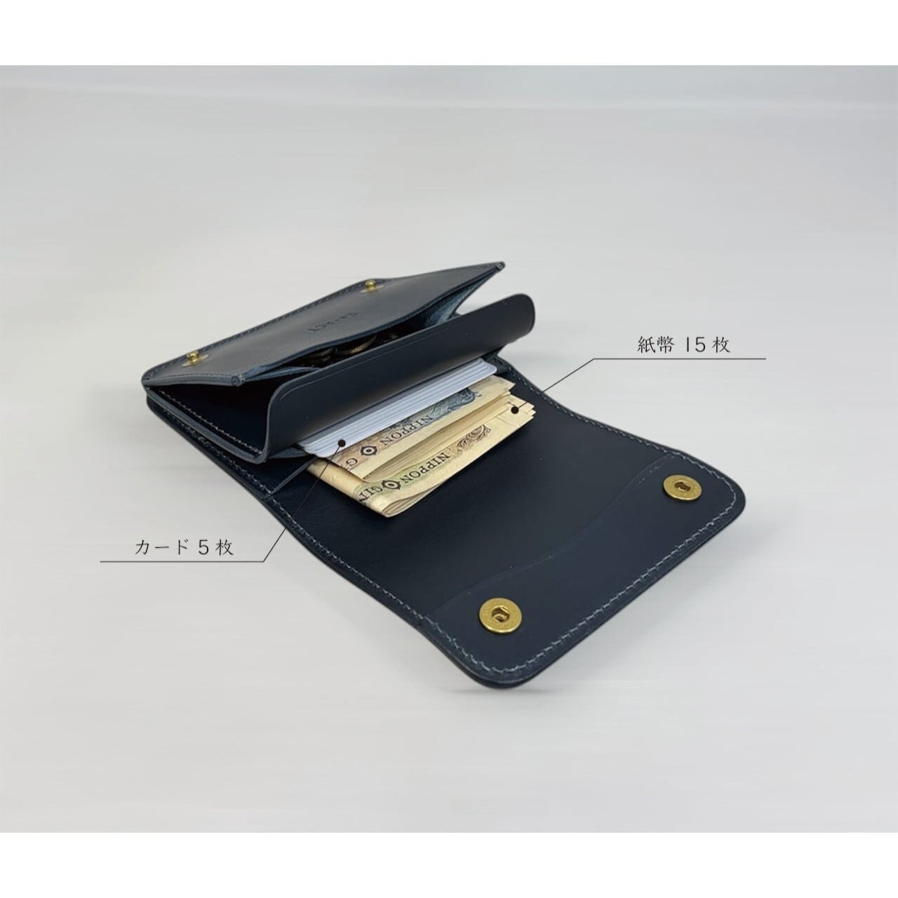無駄な装飾を削ぎ落としたミニマルな外観ながら、内装は機能性を徹底追求。二つ折りの紙幣スペース、最大5枚のカードポケットに加え、マチ付きで深さのあるコインポケットを装備し、コンパクトながらも頼もしい収納力を誇ります。