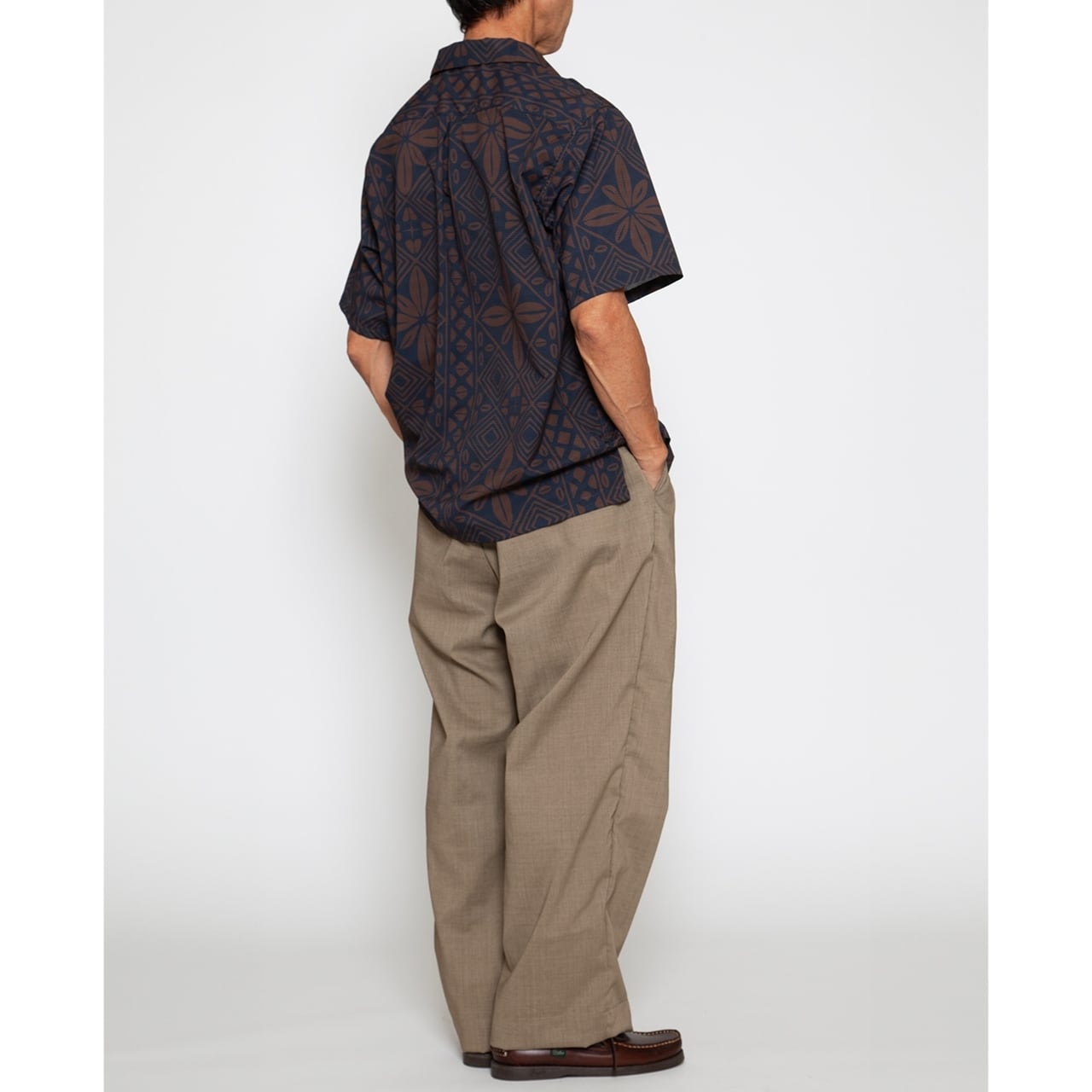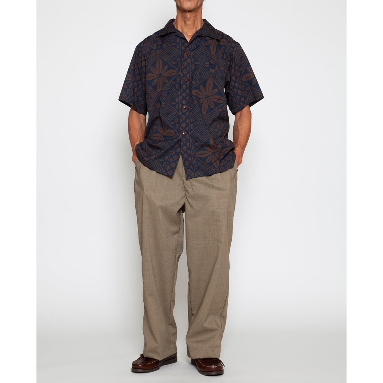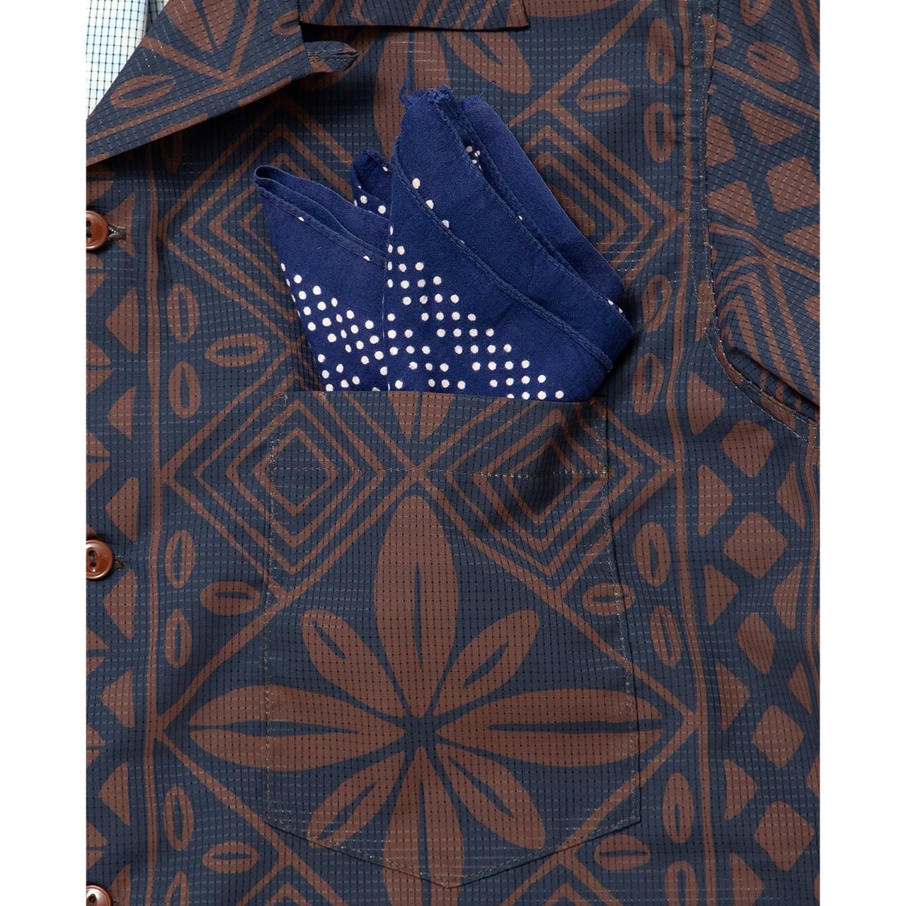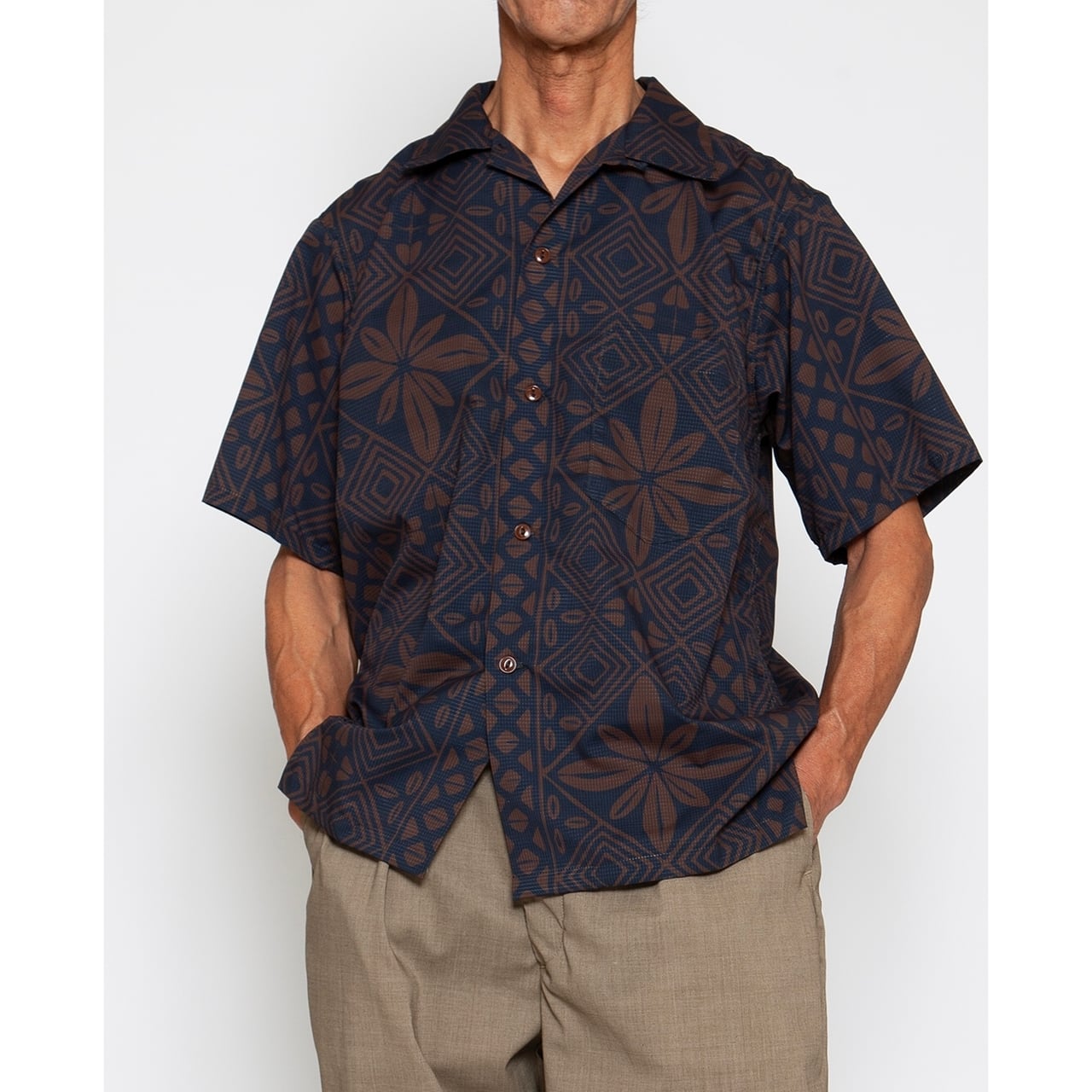 これは60年代のフランス映画に登場するシャツの柄を自社で模写したもので、アメリカのハワイアン柄とは一線を画す、イタリアのリゾート地を彷彿とさせる洗練されたムードが漂います。