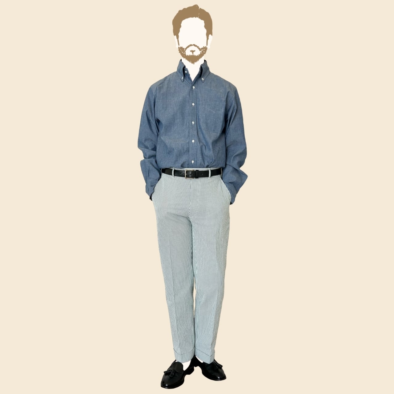 トップスには、IVY B.D. Chambray SHIRTを着用。シャンブレー特有の風合いとボタンダウンの襟元が、正統派なアイビー感を漂わせつつ、軽やかな印象を与えます。